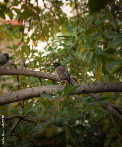 Common Myna bird sitting on a tree branch during the golden hour in India