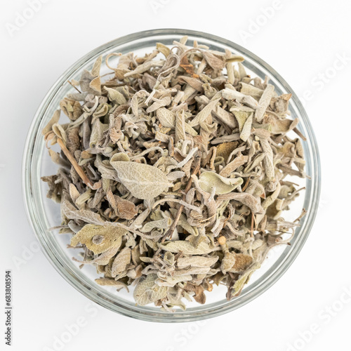 Common Sage (Salvia officinalis ) on glass plate, white background