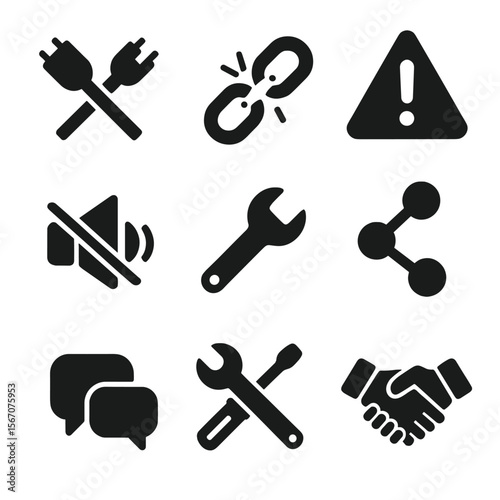 Communication Icons Grid. Solid, filled icons set of communication barriers and solutions: crossed wires,