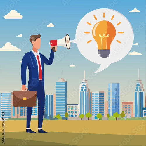 Communication, marketing message to communicate with consumer, advertising strategy, media or announcement information dialogue, businessman talking on megaphone with speech bubble lightbulb ide