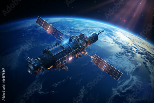 Communication satellite gracefully orbiting Earth, tirelessly connecting the world. Ai generated