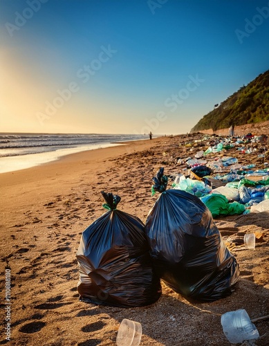 Community cleanup effort removing waste from a polluted beach bags filled with trash