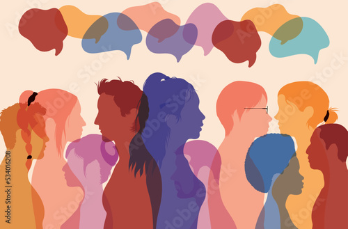 Community social network for communication and discussion. Meeting group of friends or teamwork. Speech bubble. Multi-ethnic group sharing ideas.