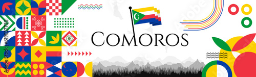 Comoros national day abstract banner design with flag and map. Flag color theme geometric pattern retro modern Illustration design. Yellow, blue, green, red flag color template.