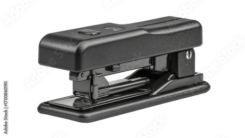 Compact, black, rectangular office tool. Features a hinged, blade-like mechanism. Small, control buttons are visible. Solid, durable construction