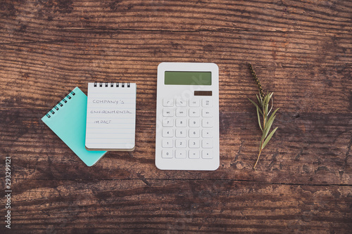 Company's Environmental Impact message on notead next to calculator and dry leaves