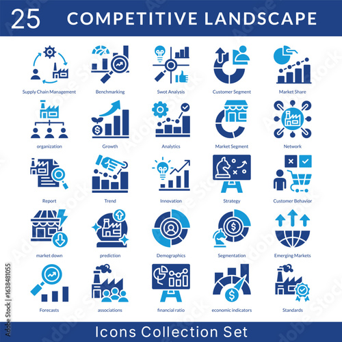 Competitive Landscape icon set collection in solid glyph style. an icon pack contain organization, growth, analytics, market segment, network, report, trend, innovation, strategy