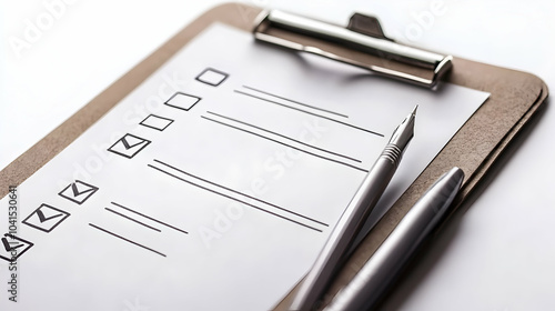 Completed checklist on a clipboard with a pen. Isolated on white background -