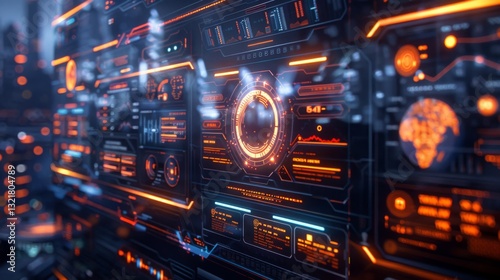 Complex digital display fills the scene with glowing orange and blue lights, illustrating data and analytics against a dark urban backdrop at night.