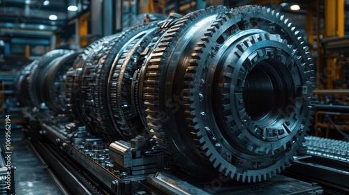 complex gears and cogs interlocking in a futuristic factory setting, illuminated by soft blue lights, showcasing automation and efficiency in industrial processes