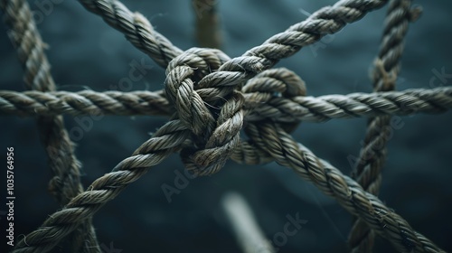 Complex web of interconnected ropes symbolizing intricate business relationships and antitrust challenges, with a focused foreground rope representing the effort to break monopolies