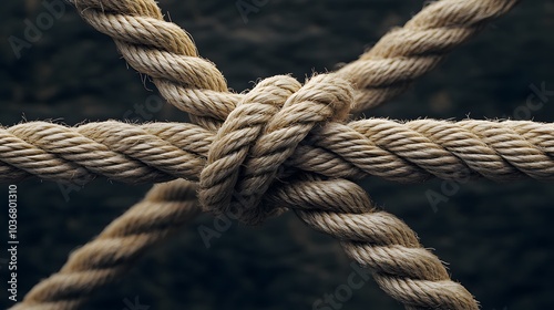 Complex web of interconnected ropes symbolizing intricate business relationships and antitrust challenges, with a focused foreground rope representing the effort to break monopolies.