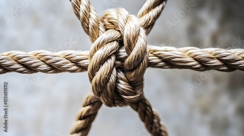 Complex web of interconnected ropes symbolizing intricate business relationships and antitrust challenges, with a focused foreground rope representing the effort to break monopolies.