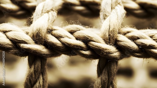 Complex web of interconnected ropes symbolizing intricate business relationships and antitrust challenges, with a focused foreground rope representing the effort to break monopolies.