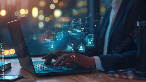 Compliance rules and law regulation policy. Businesses use laptops with compliance icons for enforcement of laws, regulations, and standards design