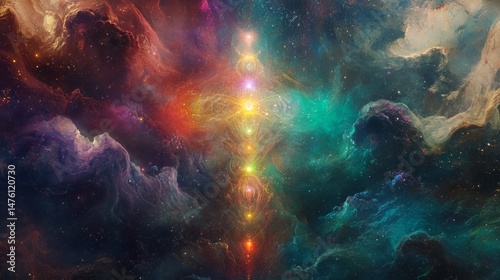 Composed of intricate, ever-flowing radio signals, the figure pulses with divine chakra energy, immersed in a boundless ocean of iridescent geological waves.