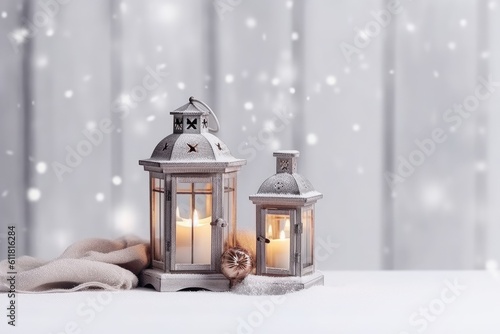 composition for Christmas. against a white background, a small table with gifts, lanterns, and decorations. Concept of Christmas, Winter, and New Year. place a copy Generative AI