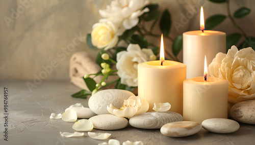 Composition of burning candles, spa stones and flowers on table. Space for text