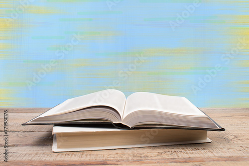 Composition with hardback books, fanned pages on wooden deck table and blue background. Books stacking. Back to school. Copy Space. Education background.
