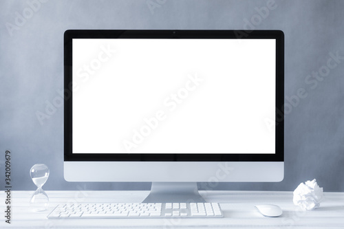 Computer all in one mockup, home and office workspace concept. Computer white blank screen on work table front view. Copy space