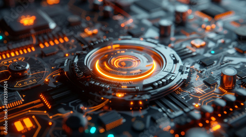computer circuit board with orange neon light, technology chip, motherboard