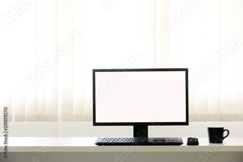 Computer, Desktop PC. for business ,background blur of curtain window.copy space.