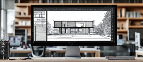 Computer monitor displays a house architectural plan in an office setting, desk with office supplies