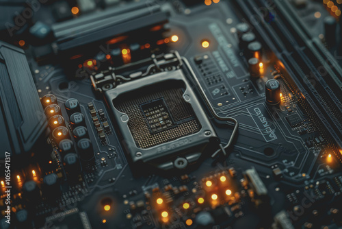 Computer motherboard with complex circuits and microchips focused on technology.