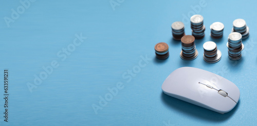 Computer mouse and coins on the blue background.