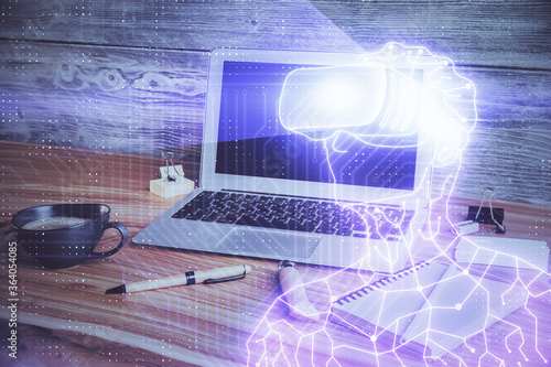 Computer on desktop with AR theme icon. Multi exposure. Concept of augmented reality.