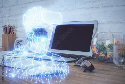 Computer on desktop with AR theme icon. Multi exposure. Concept of augmented reality.