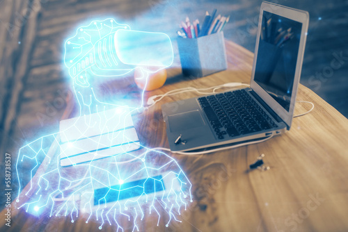 Computer on desktop with AR theme icon. Multi exposure. Concept of augmented reality.
