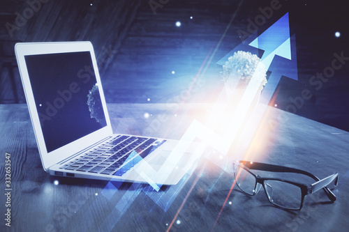 Computer on desktop with point up arrows hologram. Double exposure. Concept of success.