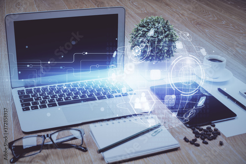 Computer on desktop with social network hologram. Double exposure. Concept of international people connections.