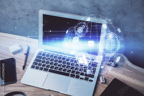 Computer on desktop with social network hologram. Multi exposure. Concept of international people connections.