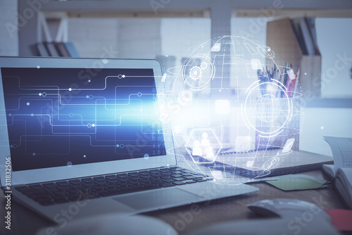 Computer on desktop with social network theme icon. Multi exposure. Concept of international connections.