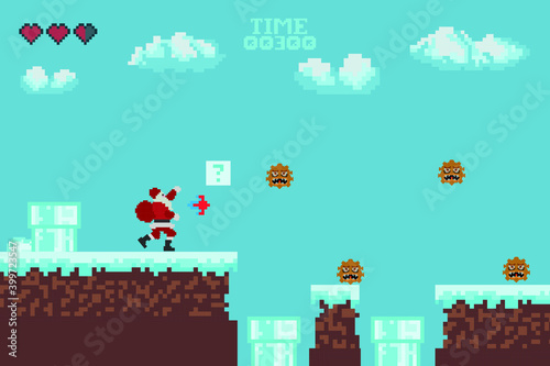 Computer pixel game interface, santa claus character, 8-bit view, hero battle in video game. Pixel winter with snow