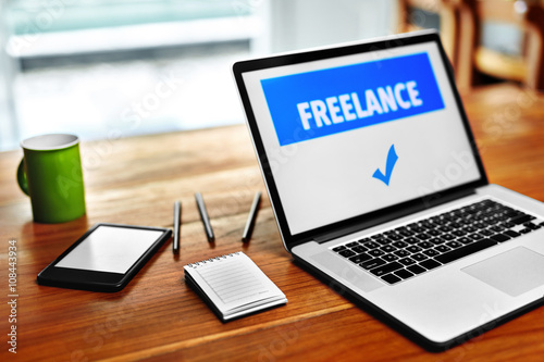 Computer Technology. Freelance Work Concept. Closeup View Of Working Notebook Screen With Word Freelance On It. Laptop, E-book, Notes, Pencils, Coffee On Wooden Table At Cafe. Business Concept