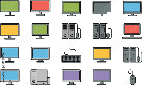 Computer technology icons set minimalist style various desktop configurations peripherals and monitors