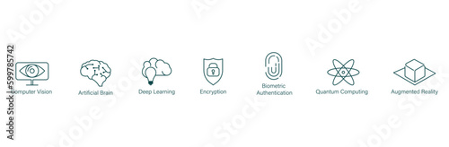 computer vision, deep learning, artificial brain, encryption, biometric authentication, quantum computing, augmented reality icon set vector illustration