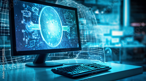 Computer with code on screen and hi-tech background, monitor, mouse and keyboard, colourful background