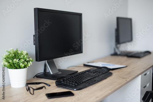 computers with blank screens in modern office