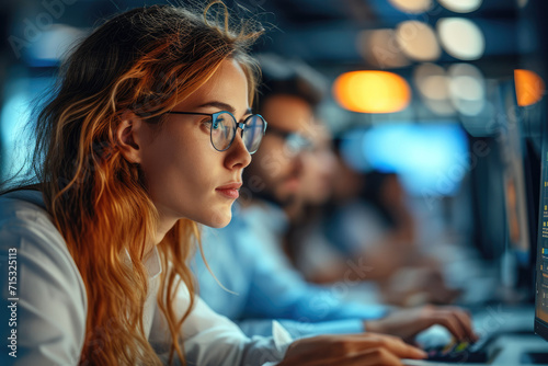 Concentrated colleagues in office using computer. Generative AI.
