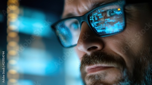 Concentrated male operator analyzes data on screens in a state-of-the-art tech support center during a busy work shift