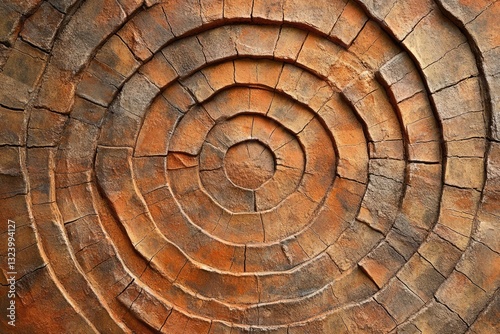 Concentric circles of aged, textured reddish-brown stone create a captivating pattern.