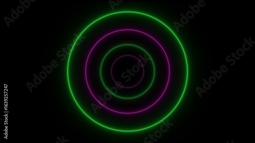 Concentric neon green and purple glowing circles on a black background abstract illustration
