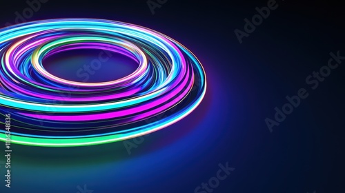 Concentric neon rings in vivid blue, violet, and green radiate outward on a dark background, creating a pulsating, futuristic energy flow with glowing edges.