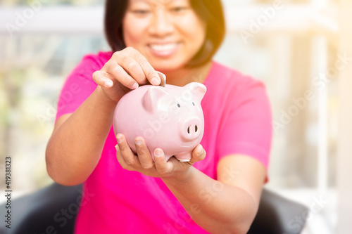 Concept business woman hand putting money coin into piggy bank saving money for future plan and retirement fund, Female smailing show putting coin saving and investment money for prepare financial.