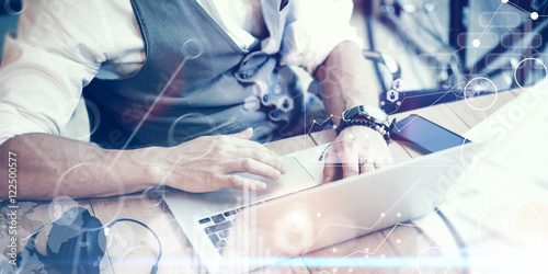 Concept Global Strategy Virtual Icon Diagram Graph Interface Innovations Reserch.Bearded Businessman Searching Great Business Decisions.Young Man Working Laptop Startup Project. Blurred Wide.