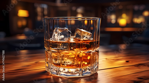 Concept illustration of whiskey bottle with a glass filled with drink on table